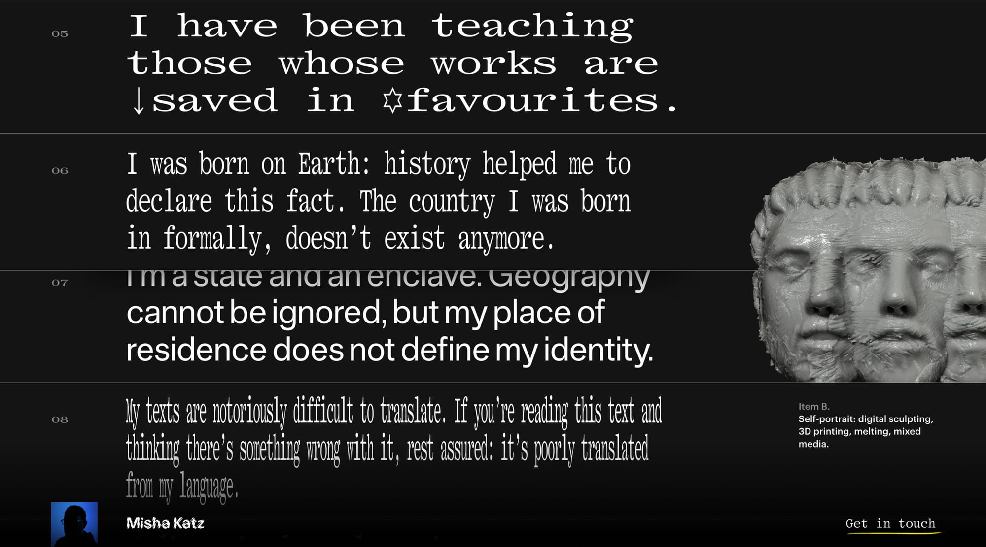 However, at some point in a designer’s career, the phase of eagerly taking on any (or almost any) incoming project comes to an end, says Misha Katz, a 3D artist and educator. This shift marks the beginning of more deliberate choices. The portfolio then ceases to be a mere capitalist construct and transforms into a statement.