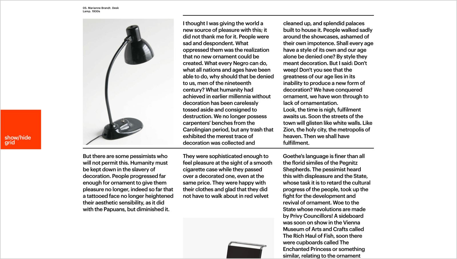 “Ornament and Crime” is another example: it’s an experiment with grid-based layouts to show how we can make web pages more interesting without adding extra stuff. Two different layouts for the same content were created, then made to blend together as you scroll down.